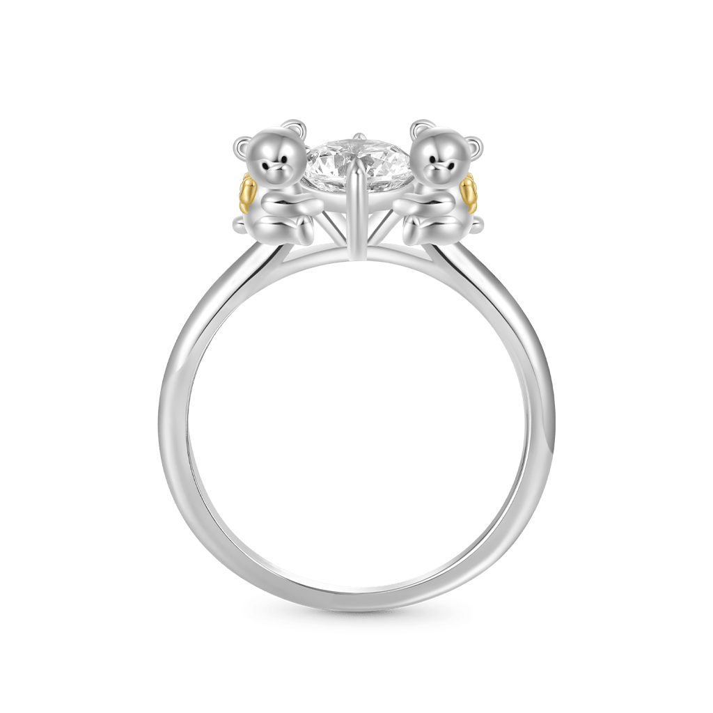 It's a sweet and romantic jewelry design that combines adorable bear figures with a dazzling gemstone element, making it a perfect gift for couples, anniversaries, or as a special love gift. The design of this ring is inspired by the warmth of love, with two cute bears embracing a gemstone in the center, symbolizing the companionship and protection between lovers.