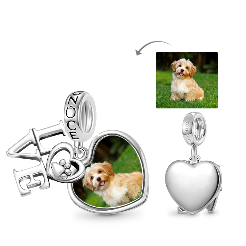 Happiness is waking up in the morning with a doggy on your head and having a dog as a friend. Made of 925 sterling silver, this charm features a double design, with a love dangle, the photo charm is designed for your four-legged friends. Add one photo to design a charm that is completely your own, special, and unique, and show your love and care in a beautiful way.