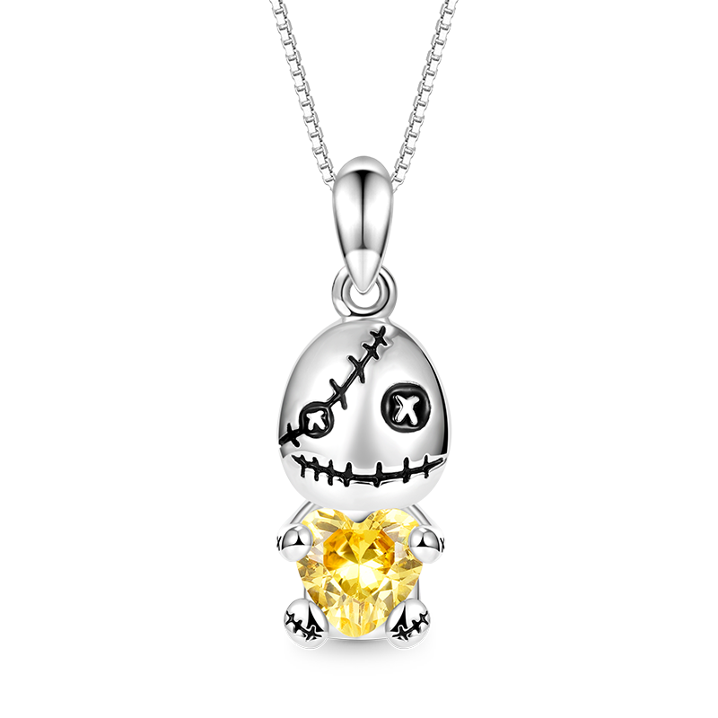 Crafted in 925 sterling silver, this Gnoce Voodoo Doll Embraces Heart Gem Necklace features a heart-cut center stone and an adorable doll wrapped around a sparkling heart-shaped gemstone. This unique necklace is chic and unusual, perfect as a Halloween gift, give it to a friend and he will be happy.